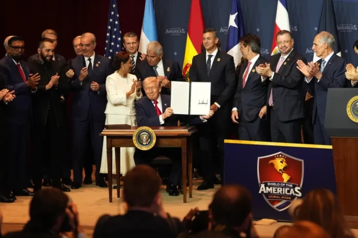 MIAMI.-El presidente Trump prometió utilizar el poderío militar estadounidense para desmantelar los cárteles de la droga y los terroristas extranjeros que operan en el hemisferio occidental al firmar la Coalición Estadounidense Contra los Cárteles junto con otras diecisiete naciones.
